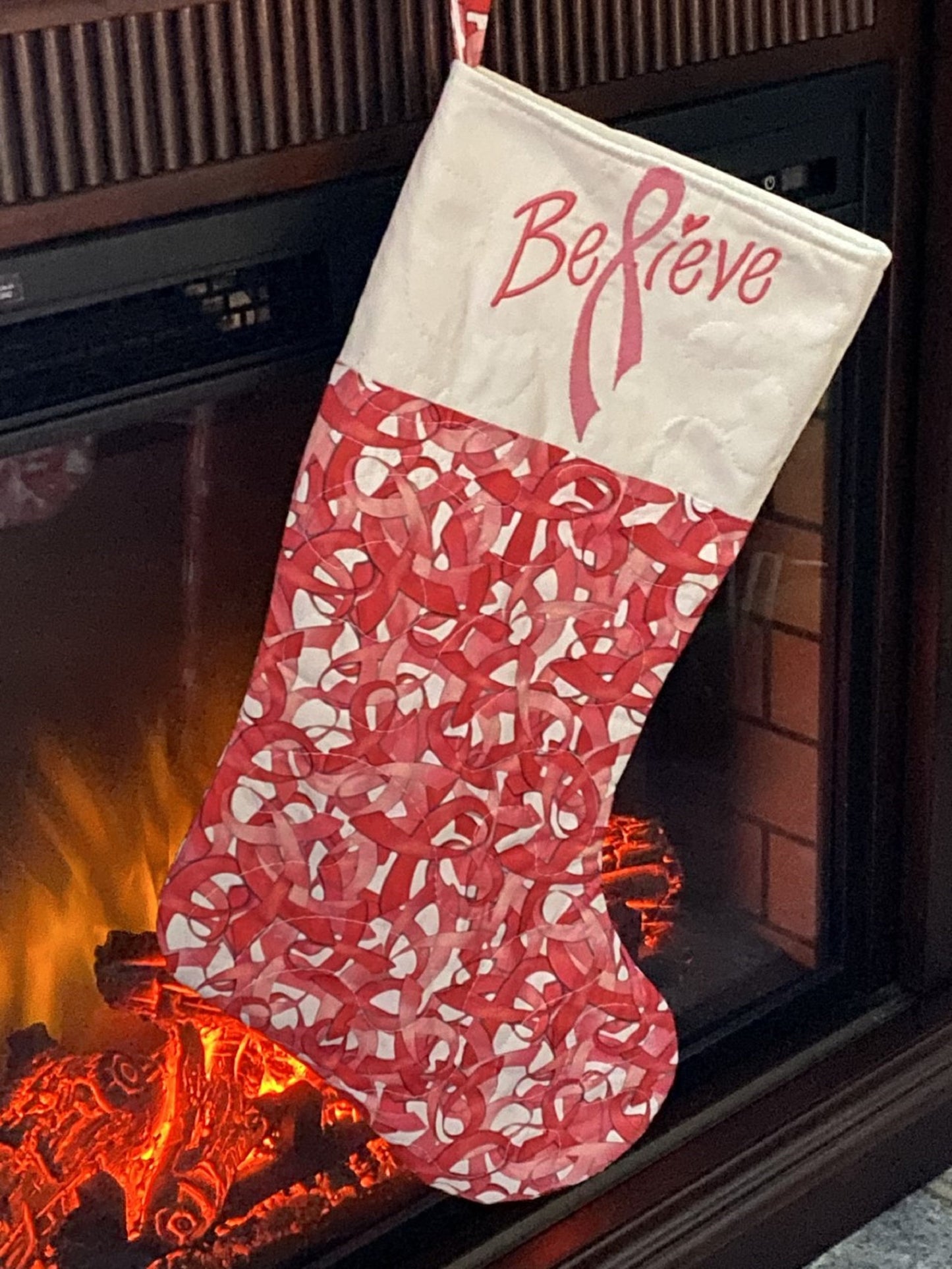 Bring hope and inspiration to your holiday décor with this beautifully handmade Christmas stocking. Featuring woven pink ribbons and the word “Believe” carefully embroidered in pink on a classic white cuff, this stocking is a heartfelt tribute to strength, support, and the spirit of the season.
