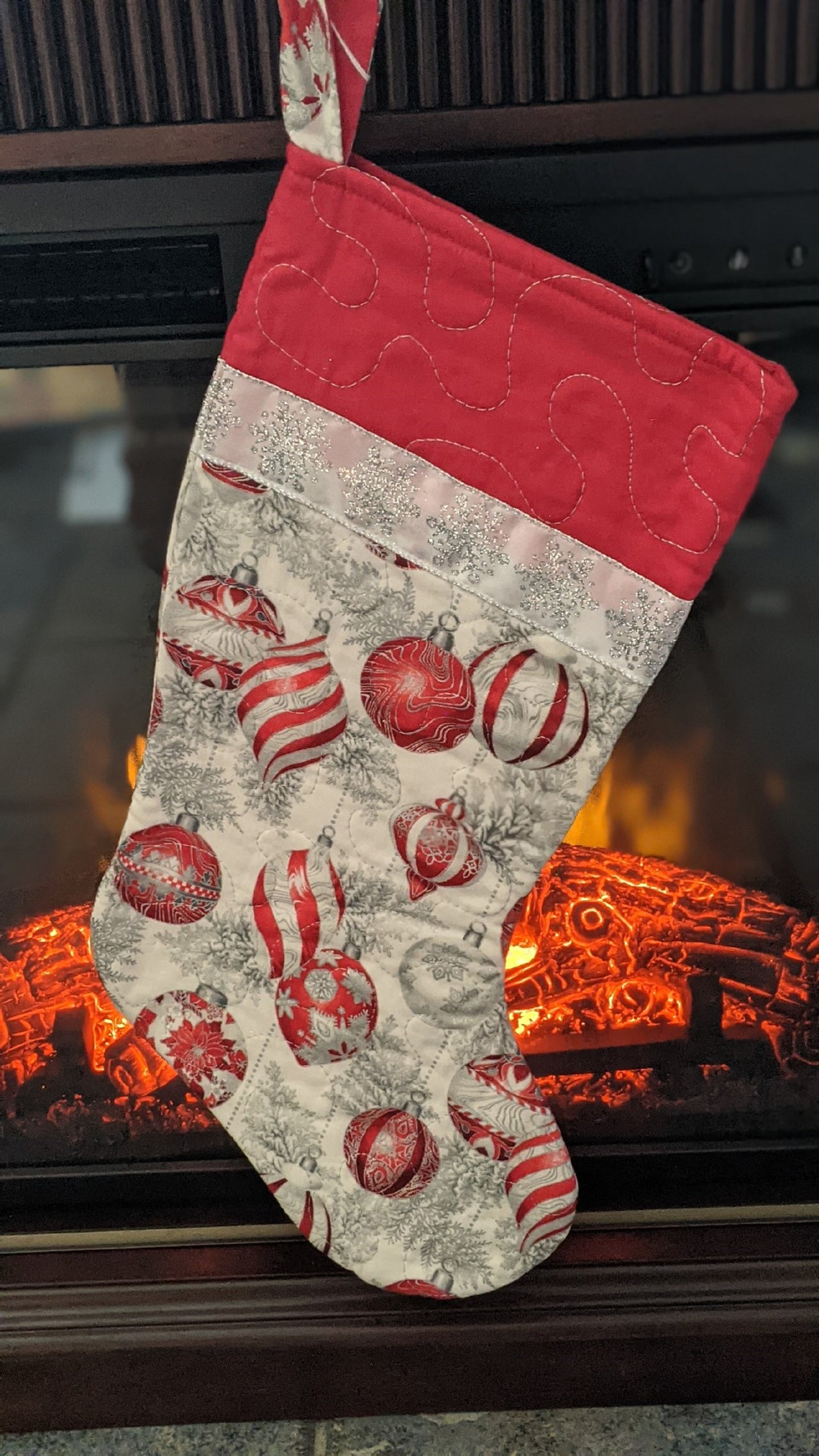 Add timeless elegance to your holiday décor with this handmade quilted Christmas stocking featuring a beautiful design of red and silver ornaments on a white background accented with silver tree branches. 🎄✨