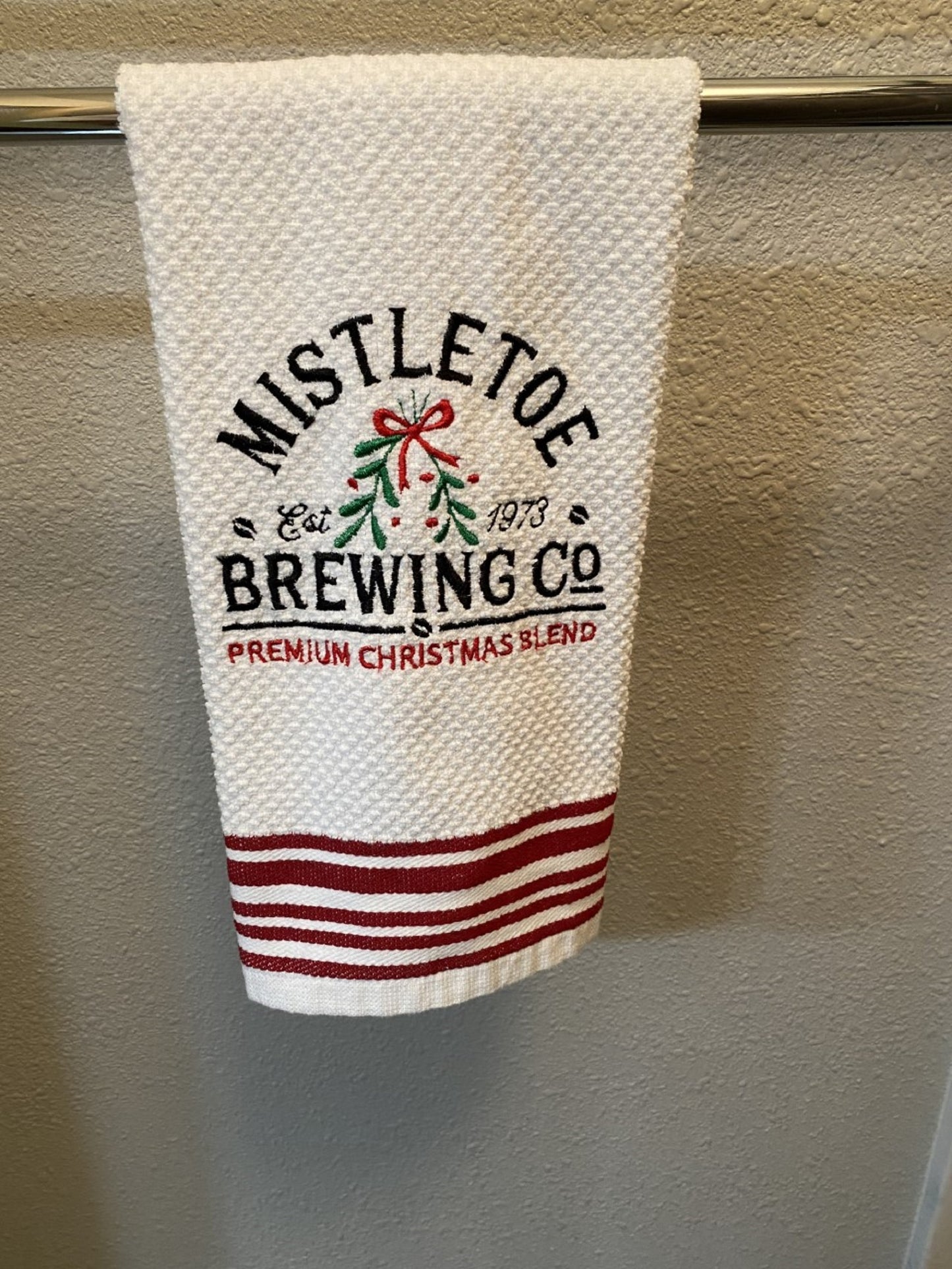 Celebrate the holiday season with this festive machine embroidered hand towel featuring the charming phrase "Mistletoe Brewing Co. – Premium Christmas Blend." Crafted from soft, absorbent 100% cotton waffle weave fabric, this white towel adds a cozy, seasonal touch to your kitchen or bathroom.